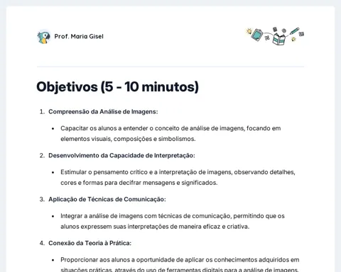 Conexão entre Teoria e Prática (5 minutos): O professor deve explicar como a aula conectou a teoria da fotografia com a prática, através da análise de fotografias existentes e da criação de fotografias pelos alunos. Ele deve enfatizar como a atividade prática permitiu aos alunos aplicar os conceitos teóricos de uma maneira significativa e relevante para o seu cotidiano.