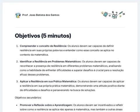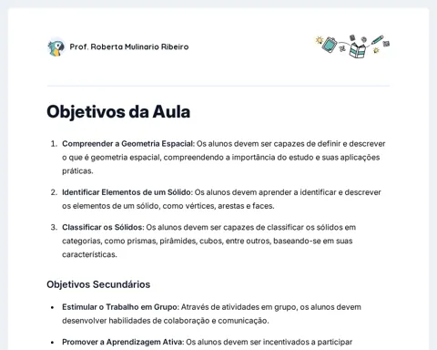 A etapa de Objetivos é crucial para direcionar o foco dos alunos e do professor, estabelecendo as metas de aprendizado que guiarão as atividades em sala. Ao detalhar os objetivos, os alunos podem melhor organizar seu conhecimento prévio e aplicá-lo de forma mais efetiva durante as atividades propostas. Além disso, esta seção serve para alinhar as expectativas e assegurar que todos os envolvidos tenham uma compreensão clara do que é esperado ao final da aula.